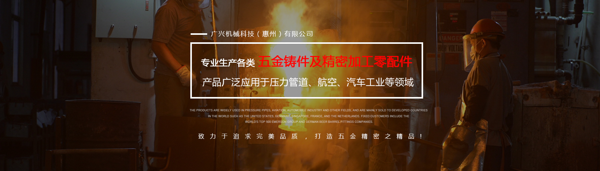 公司專業生產各類五金鑄件及精密加工零配件,可熔煉材質為全系列不銹鋼及碳鋼,主要生產材質有304、316、316L、17-4、430409等,年生產各種不銹鋼鑄件1000余噸。產品廣泛應用于壓力管道、航空、汽車工業等領域,主要銷往美國、德國、新加坡、法國、荷蘭等世界發達國家,固定客戶有世界500強艾默生集團及德國啤酒桶配件公司。